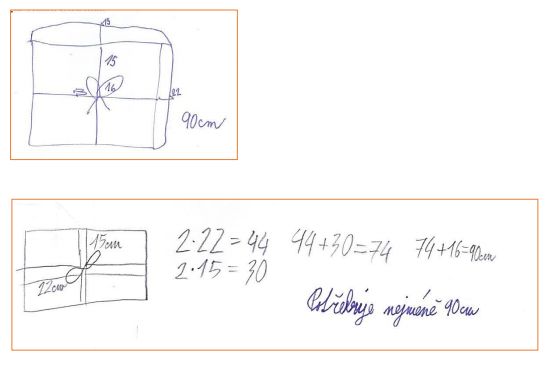 Zadání: Zbývá ti 75 cm stuhy. Bude ti stačit na zabalení blahopřání o délce 22 cm a šířce 15 cm? Na mašličku potřebuješ 16 cm.