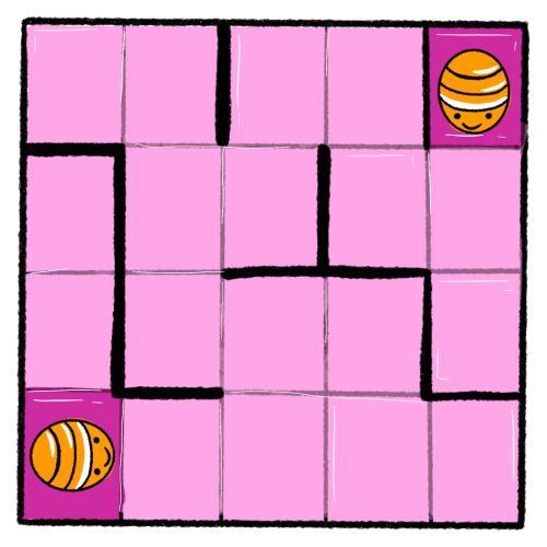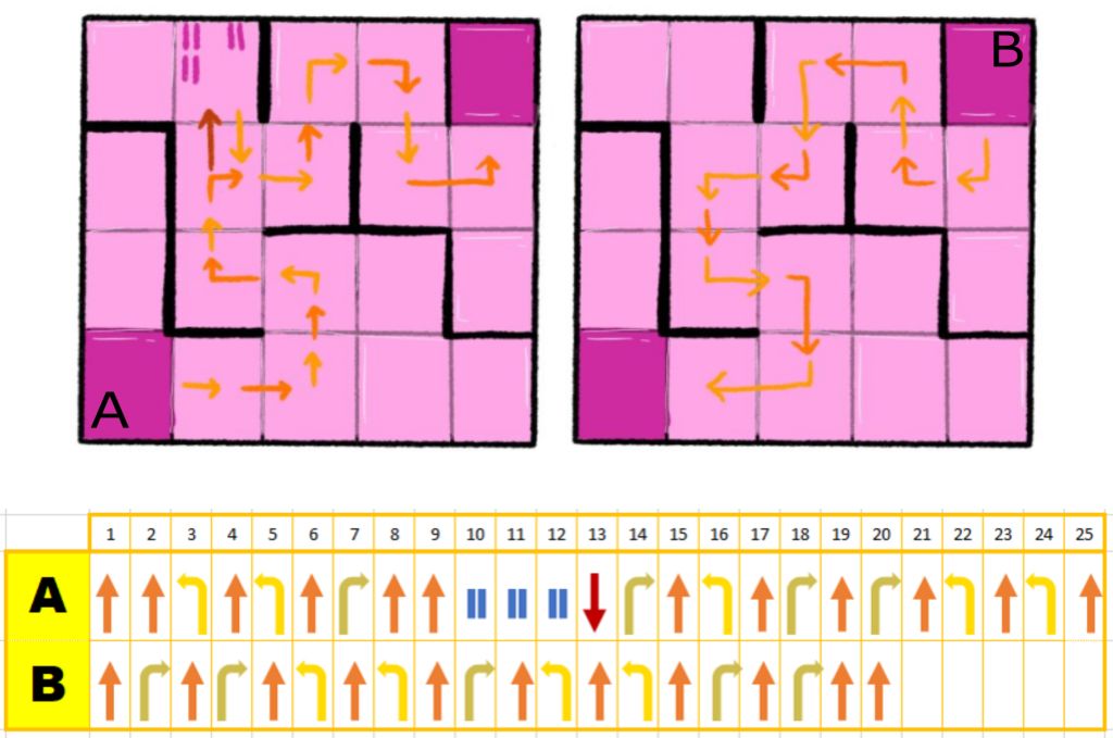 V předchozí lekci (Informatické myšlení - dekompozice) jsme se zamýšleli nad úlohou dvou robotů v bludišti. Roboti se pohybují po vyznačených čtvercích pomocí příkazů vpřed, vzad, vlevo (otočení o 90°), vpravo, pauza.